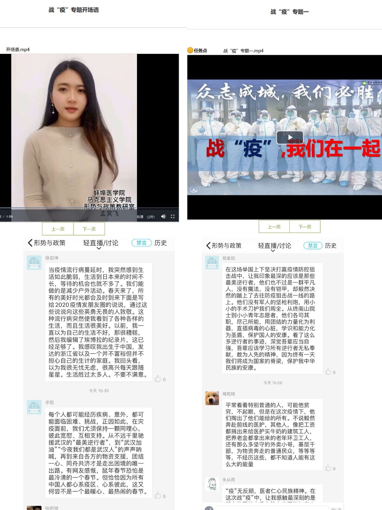 疫情防控期间线上授课实施方案》的要求,形势与政策教研室教师克服时间紧、任务重的压力,特别针对疫情发生以后学生可能容易产生的认识模糊、心理焦虑等问题,多次开展线上集体备课,切实将疫情防控的生动实践转化为鲜活教学,并通过中国脊梁、中国力量、中国速度、中国制度和中国精神五个方面,由浅入深、层层递进的为授课班级同学们讲授了这场史诗般战“疫”为什么一定能取得胜利的根本原因之所在。教学中,广大同学围绕“在这场举国上下坚决打赢疫情防控战中,让你感触最深的是什么”和“从疫情发生以来,有哪些瞬间真正打动了你”等问题展开了激烈讨论。