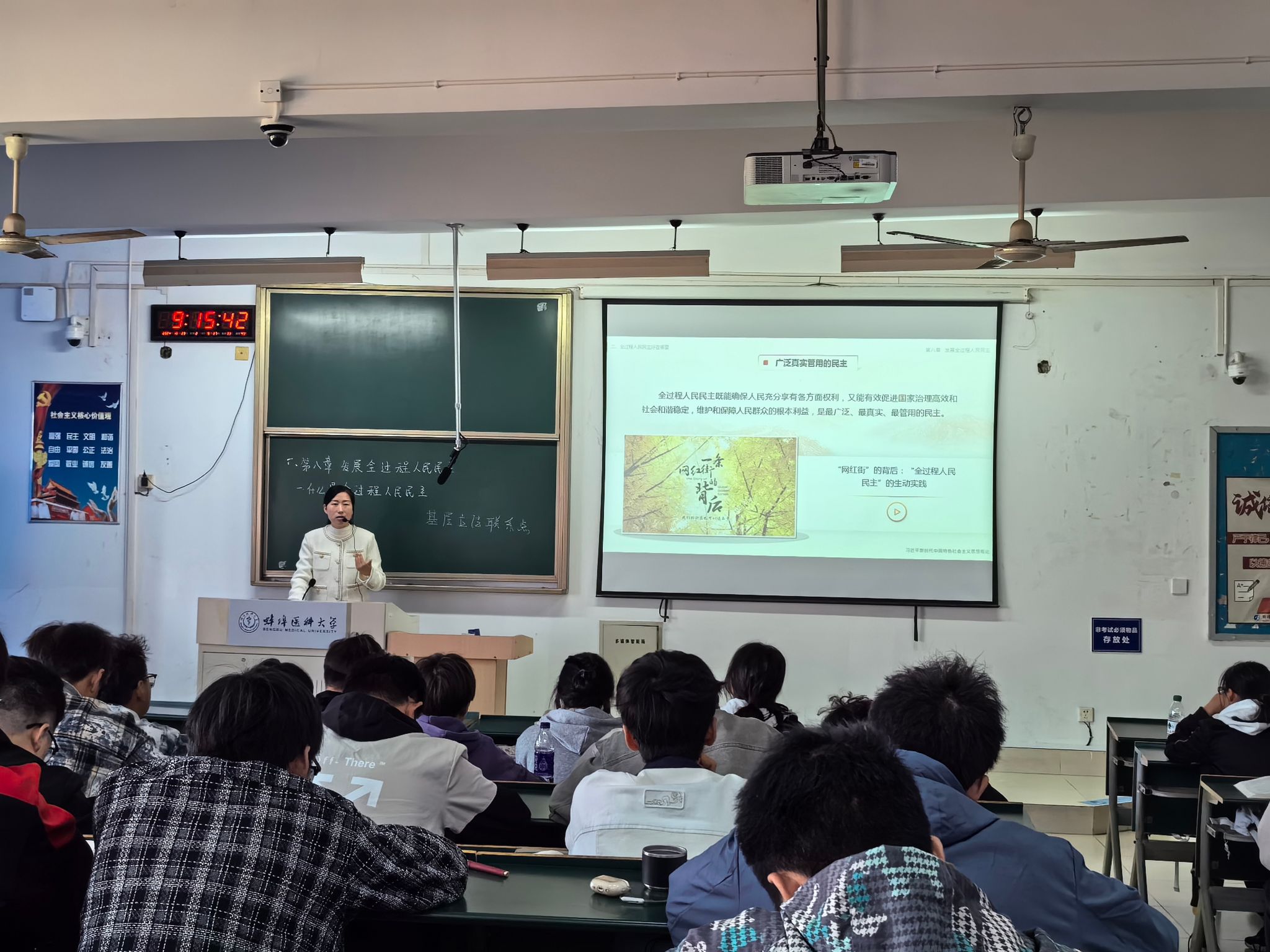 杨莉艳老师以“发展全过程人民民主”为教学主题,通过生动的案例分析和深入浅出的理论讲解,深刻阐述了全过程人民民主是最广泛、最真实、最管用的民主,有效增强了学生的政治敏锐性、政治鉴别力和透过现象看本质的洞察能力,着力引导学生对全过程人民民主的思想认同和政治认同。同时,在授课过程中,杨老师注重把党的二十届三中全会精神融入课堂教育教学,有效丰富了教学内容的理论深度和实践高度。