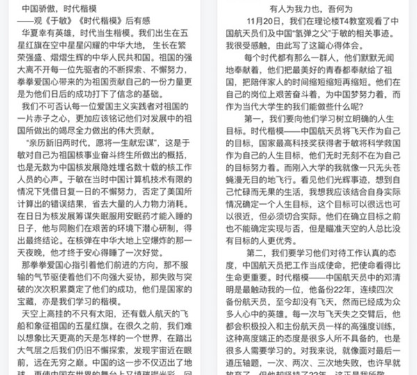教育纪录片观看结束后,同学们在学习通上写下了自己的心得体会,大家纷纷表示,时代楷模的事迹感动人心、温暖人心、更振奋人心,要以时代楷模于敏和航天员群体为榜样,坚定理想信念、厚植爱国主义情怀,努力学习、不怕吃苦,努力做担当民族复兴大任的时代新人。