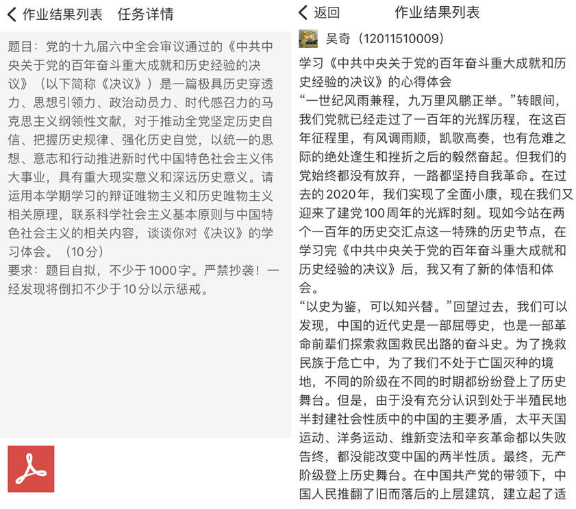 “原理”教研室充分利用移动辅助教学平台优势,结合本学期所学习的辩证唯物主义和历史唯物主义相关原理,联系科学社会主义基本原则与中国特色社会主义的相关内容,安排学生认真研读《决议》内容,运用所学马克思主义基本原理知识,并结合《决议》内容来谈自己的学习体会,撰写一篇不少于1000字的小论文进行阐述。同学们课后经过认真研读《决议》内容,理论联系实际,纷纷表示对党的百年奋斗重大成就和历史经验有了更深刻的认识,更加坚定了听党话、感党恩、跟党走的决心,为中华民族的伟大复兴贡献自己的力量。