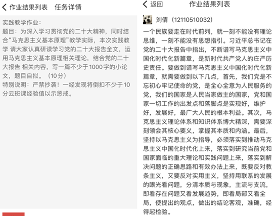 “原理”教研室充分利用移动辅助教学平台优势,结合本学期所学习的辩证唯物主义和历史唯物主义相关原理,安排学生认真研读学习党的二十大报告内容,运用所学马克思主义基本原理知识,并结合二十大精神来谈自己的学习感悟,撰写心得体会小论文。同学们课后经过认真研读学习党的二十大报告内容,理论联系实际,纷纷表示对党的二十大报告所阐明的大会主题有了更深刻的认识,更加坚定了听党话、感党恩、跟党走的决心,为中华民族的伟大复兴贡献自己的力量。
