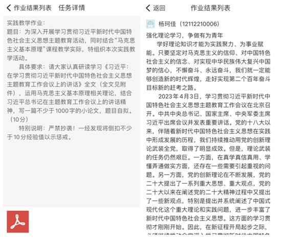 “原理”课充分利用移动辅助教学平台优势,结合本学期所学习的辩证唯物主义和历史唯物主义相关原理,组织学生认真研读学习习近平总书记在学习贯彻习近平新时代中国特色社会主义思想主题教育工作会议上的重要讲话精神,并运用所学原理知识,谈谈自己的学习体会。同学们课后经过认真研读学习习近平总书记的重要讲话精神,理论联系实际,纷纷表示对学习贯彻习近平新时代中国特色社会主义思想主题教育有了更深刻的认识,更加坚定了听党话、感党恩、跟党走的决心,立志为中华民族的伟大复兴贡献自己的青春力量。