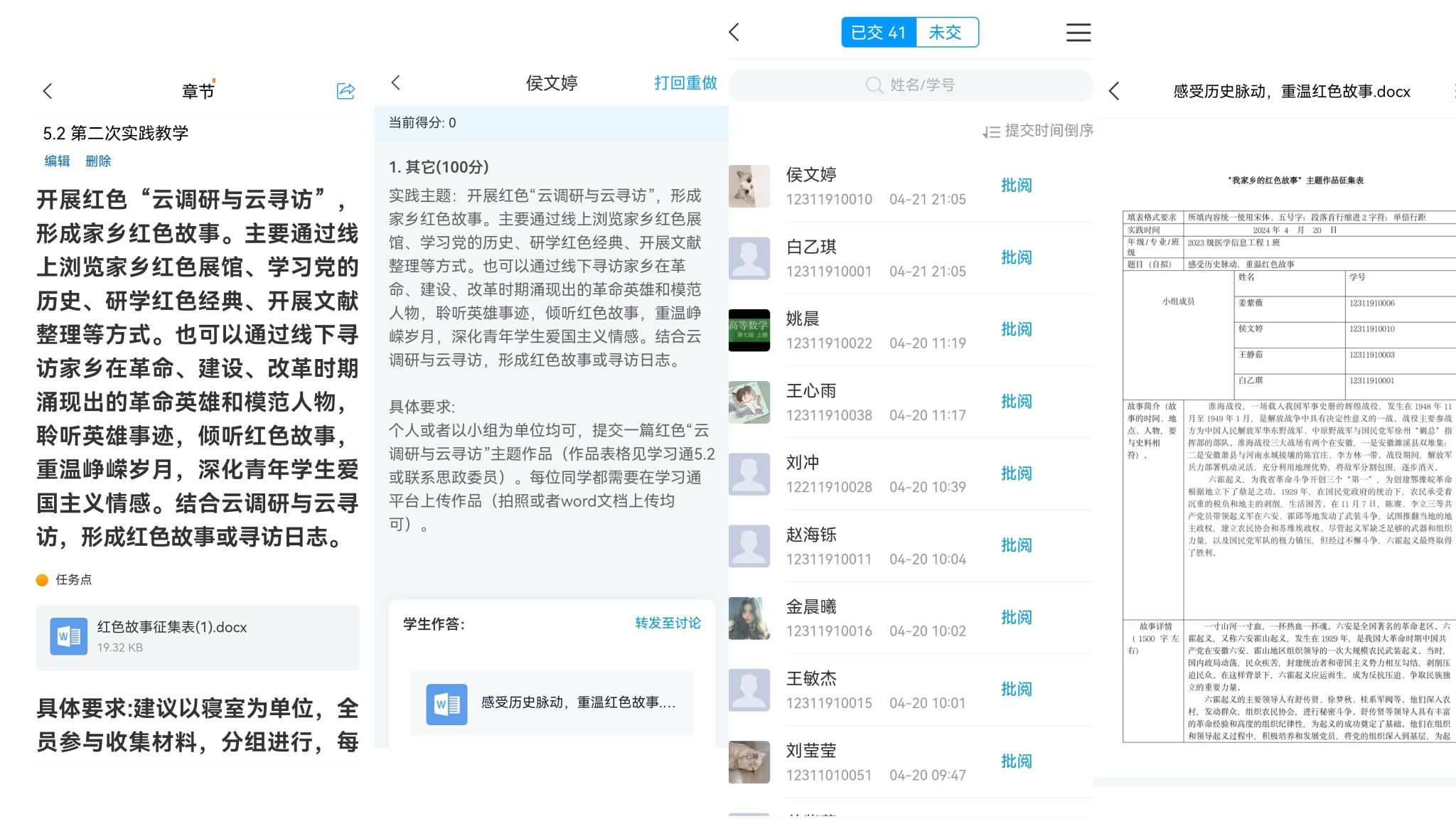 课程授课教师根据教学班级的实际情况制定了多样化的实践教学形式载体和活动内容,如引导学生围绕中华人民共和国成立75周年、五四精神等主题,结合教育教学内容进行深入思考,撰写学习心得体会;开展线上红色“云调研与云寻访”,引导学生通过线上浏览家乡红色展馆、学习党的历史、研学红色经典、开展文献资料收集整理等;亦或利用“五一”假期动员学生线下寻访家乡在革命、建设、改革时期涌现出的革命英雄和模范人物,聆听英雄事迹,倾听红色故事,重温峥嵘岁月,深化青年学生爱国主义情感,并结合云调研与云寻访,形成红色故事或寻访日志。