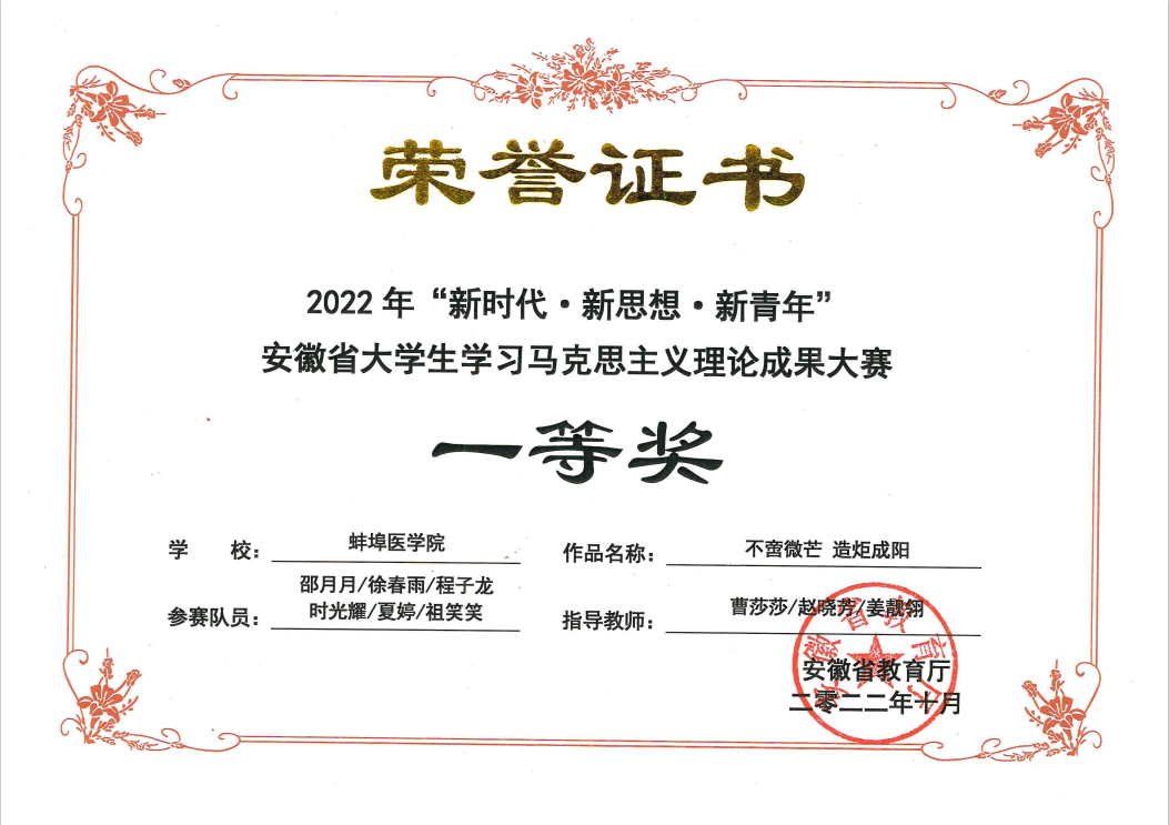 TopToon 学子在第四届“新时代·新思想·新青年”安徽省大学生学习马克思主义理论成果大赛省级中再获佳绩,推荐的《不啻微芒 造炬成阳——我是一名思政委员》等5件作品全部获奖,其中一等奖1项、二等奖2项、三等奖2项,3名教师获“优秀指导教师”,学校再获“最佳组织奖”。