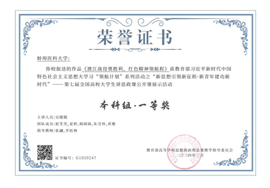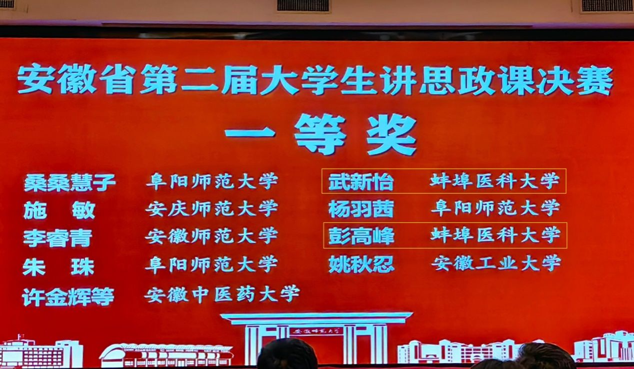 学生在省大学生党史知识学习竞赛活动中,同来自全省90余所高校的63071位参赛者中脱颖而出,在现场决赛中取得二等奖2名、三等奖3名的好成绩;8名学生在安徽省首届大学生红色文化学习与创意设计成果三大类比赛中获二等奖2项、三等奖6项;2023年,1支学生团队获第二届全国大学生红色全景资源创意展示大赛二等奖,2支学生团队在安徽省第二届大学生讲思政课活动中均获一等奖、4名教师获优秀指导教师。