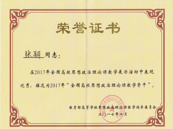 青年教师张翮通过省级遴选和全国教指委专家网络在线评审,作为全省两名选手之一参加活动,以全国第25名(共58人入围)的成绩获得“全国高校思想政治理论课教学骨干”称号。
