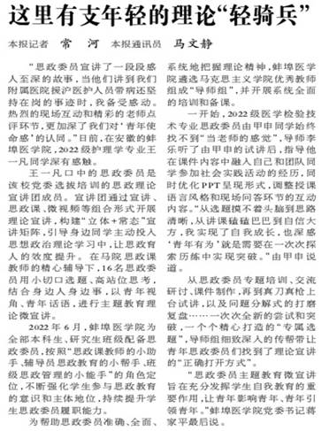 紧扣发挥思政课教师育人关键作用是落实好立德树人根本任务的内在要求。坚持抓好学习研讨和集体备课会,及时将习近平总书记最新重要讲话指示批示精神和党的理论创新最新成果融入教育教学;强化实践教学,依据课程特点制定实践教学适时方案,结合教学内容和重要时间节点,认真组织开展系列实践教学活动;多次举办“英模·大师进校园”讲思政课,全面推进思政课程改革创新。班级思政委员队伍建设成效被《光明日报》《中国教育报》《中国青年报》等媒体以“这里有支年轻的理论‘轻骑兵’”、“青年视角讲故事 朴实语言传精神”、“蚌埠医学院:思政委员交回了‘暑假作业’”为题报道。