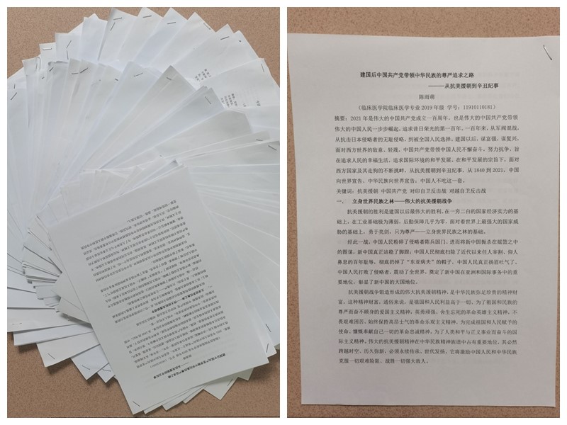 学期初开始,教研室就启动以中国共产党百年发展历程为主线,以“奋斗百年路 启航新征程”为主题,通过采取学习征文(含调研报告)的形式,以理化情“论述”党的百年光辉历程与优良传统。截止4月底共征集到多种题材论文(含调研报告)作品60余篇,教研室统一组织全体授课教师对征集作品进行分类整理并开展评审,共评选出获奖作品12件。