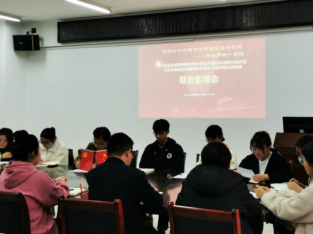 1122日,教研室还特别邀请部分班级思政委员参加“师生同备一堂课——党的二十大精神微宣讲集体备课会”。集体备课会上熊韵波、贾先果两位老师做了宣讲示范,沈庆群老师就如何将党的二十大精神全面融入思政课堂做了交流发言,各思政委员也纷纷阐述了自己的宣讲角度和教学设计。